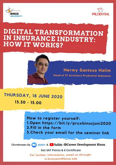 Seminar ini akan banyak membahas bagaimana transformasi digital berlangsung di Perusahaan Asuransi Prudential dan bagaimana hal tersebut membantu Prudential untuk berkembang hingga menjadi salah satu perusahaan industri terbesar saat ini. Adapun seminar ini akan dilaksanakan pada: