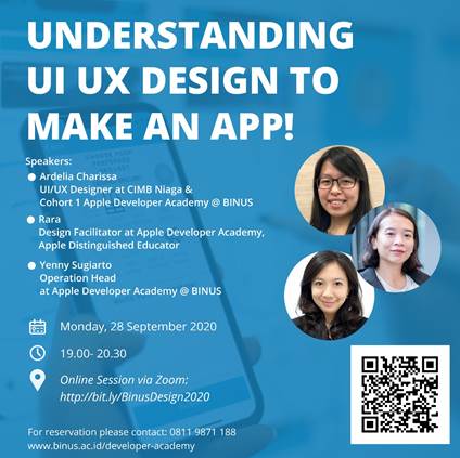 Hi Binusian 👋, Apple Developer Academy at BINUS bersama dengan School of Design BINUS University juga BINUS Alumni Relation Office (ARO) mengadakan seminar online dengan pembahasan Design UI & UX. Untuk kamu mahasiswa tahun akhir, peserta 3+1 internship tahun depan dan alumni yang terus ingin update ilmu serta informasi terbaru seputar dunia design & technology, silahkan mengikuti acara ini.