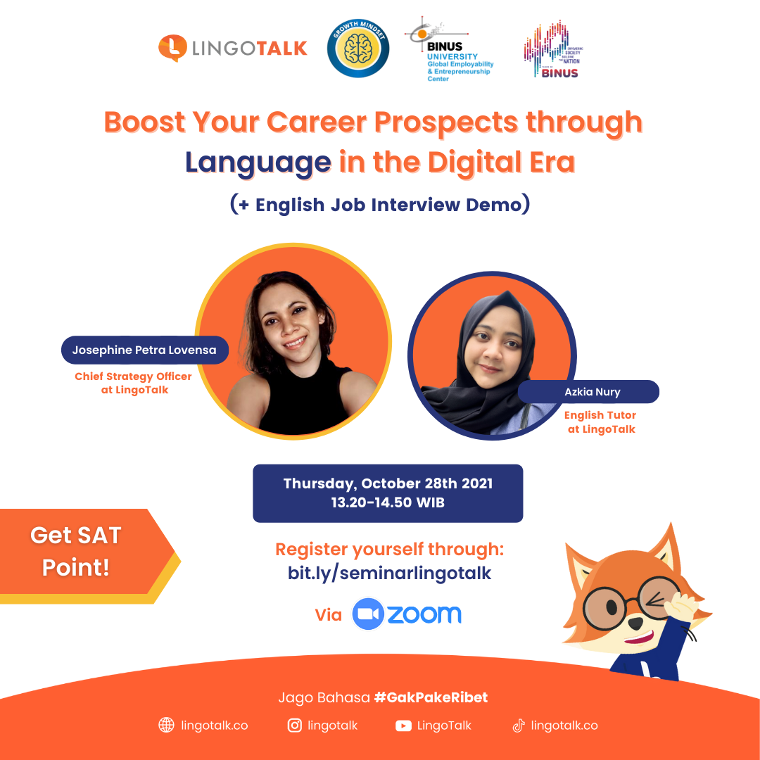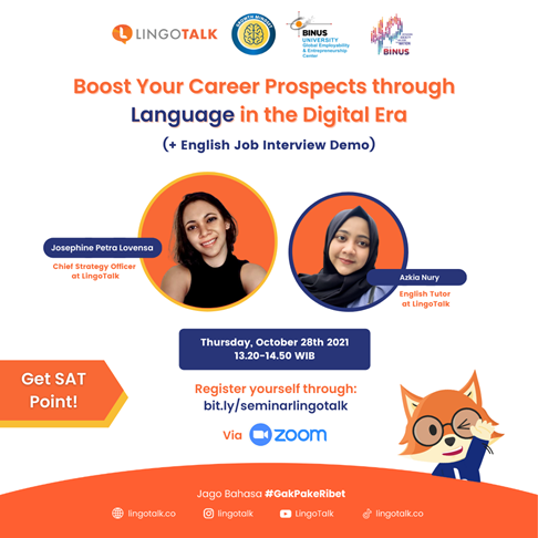 LingoTalk mengundang Binusian dalam acara ini untuk berbagi tips English for Business untuk menguasai Job Interview & Effective Business Email.