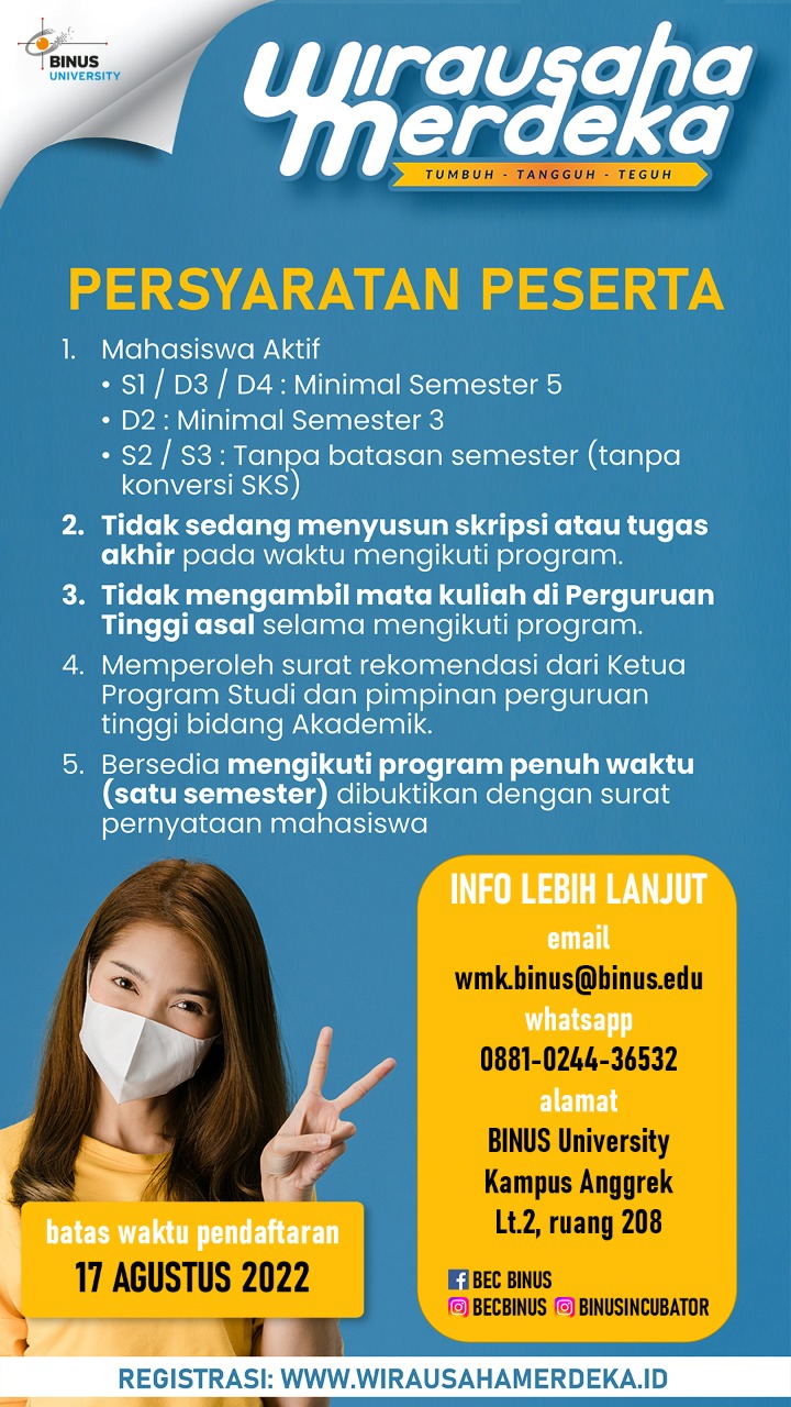Ada Info Menarik Nih. Buat Teman-Teman yang menempuh track Entrepreneur di semester 7(Binusian 23) bisa mengikuti program Wirausaha Merdeka (WMK).