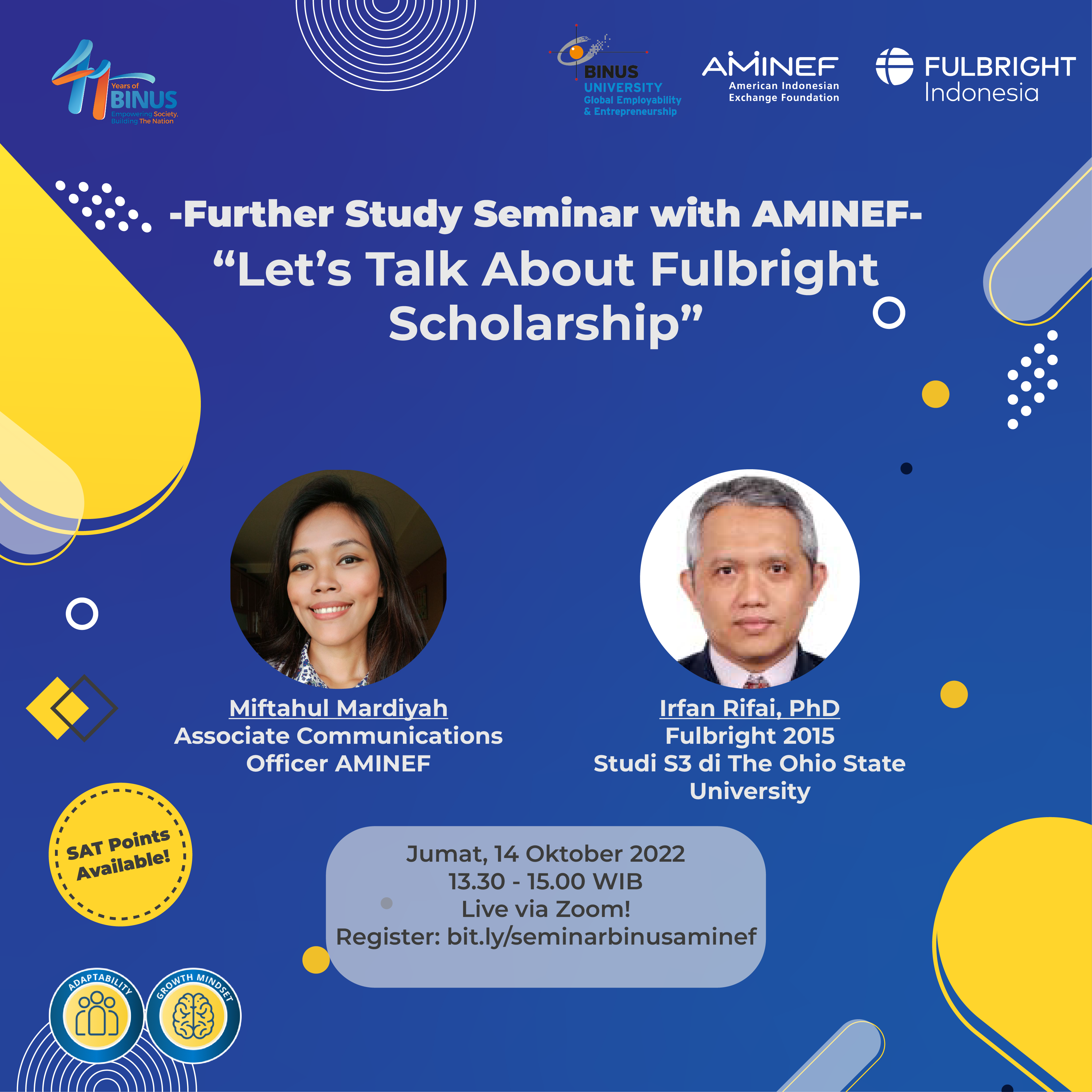 Yuk kita ikuti seminar further study bersama dengan AMINEF! Pada seminar ini kamu akan mendapatkan penjelasan mengenai apa itu AMINEF dan juga program-program beasiswa yang ditawarkan terutama Fulbright scholarship!