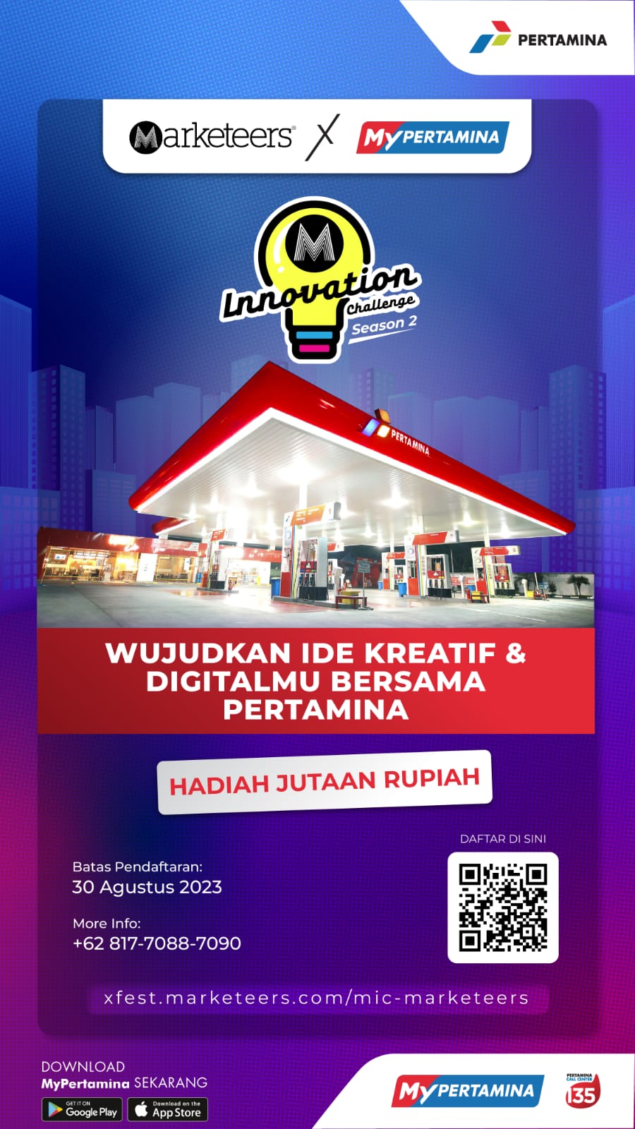 Dapatkan hadiah uang tunai senilai jutaan rupiah dan kesempatan magang di Marketeers atau kesempatan langsung bergabung bersama MyPertamina!