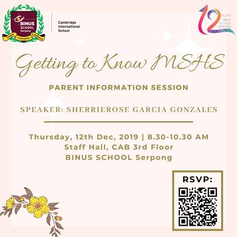 You are cordially invited to attend the Parent Information Session (PIS) “Getting to Know MSHS”.