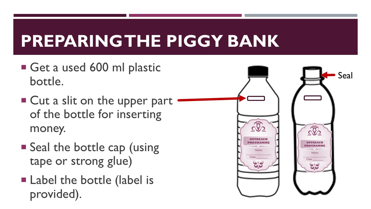 Students will save some money in a hand-made piggy bank in a period of 15 days from 7 Mar until 21 Mar. The piggy bank is to be kept at home during this period. Students will bring the saved money to school on 22 Mar 2019. Kindly encouraged your children to save daily. The instructions for the making of the piggy bank is attached. The label to be pasted on the piggy bank bottle has been sent today through your children's diary.
