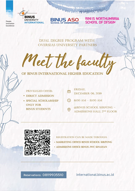 You are cordially invited to Meet the Faculty of BINUS International Higher Education on Friday, 6 December 2019 at. 08.00 - 11.00 AM (Admissions Hall 2nd Floor - BINUS SCHOOL Serpong).