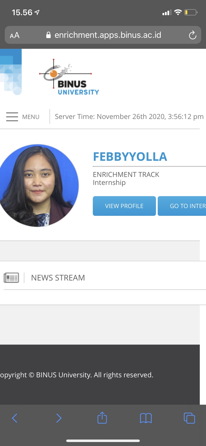Di informasikan bahwa saat ini Anda belum registrasi Enrichment Program untuk perkuliahan semester genap 2020/2021. Silakan Anda segera melakukan registrasi Enrichment Program di Binusmaya pada menu Enrichment program paling lambat tanggal 28 November 2020.