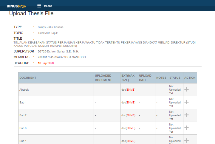 Perkenalkan nama saya Isaka Yoga Santoso (2001617841), dalam hal ini saya mengalami kendala dan hambatan untuk mengupload berkas skripsi pada halaman https://binusmaya.binus.ac.id/student/#/thesis/uploadThesisFile#form dimana berkas yang saya upload dan submit tidak dapat diprogress dan selalu mengalami page unresponsive kemudian diminta untuk menunggu, namun tetap berkas tidak terupload. Sebelumnya saya telah menghubungi melalui CHAT WITH US pada Binus Maya, staff yang menyampaikan mengatakan bahwa Server Binus Maya sedang mengalami down. Oleh karenannya mengingat Deadline pengumpulan Skripsi saya tertanggal 16 September 2020 saya hendak meminta bantuan untuk dibantu dalam mengupload berkas tersebut atau solusi lain yang dapat ditawarkan oleh Student Service Center (“SSC”). Berikut ini saya lampirkan data-data berkas Skripsi yang telah siap Upload dan Bukti telah hambatan/kesulitan dalam mengupload.