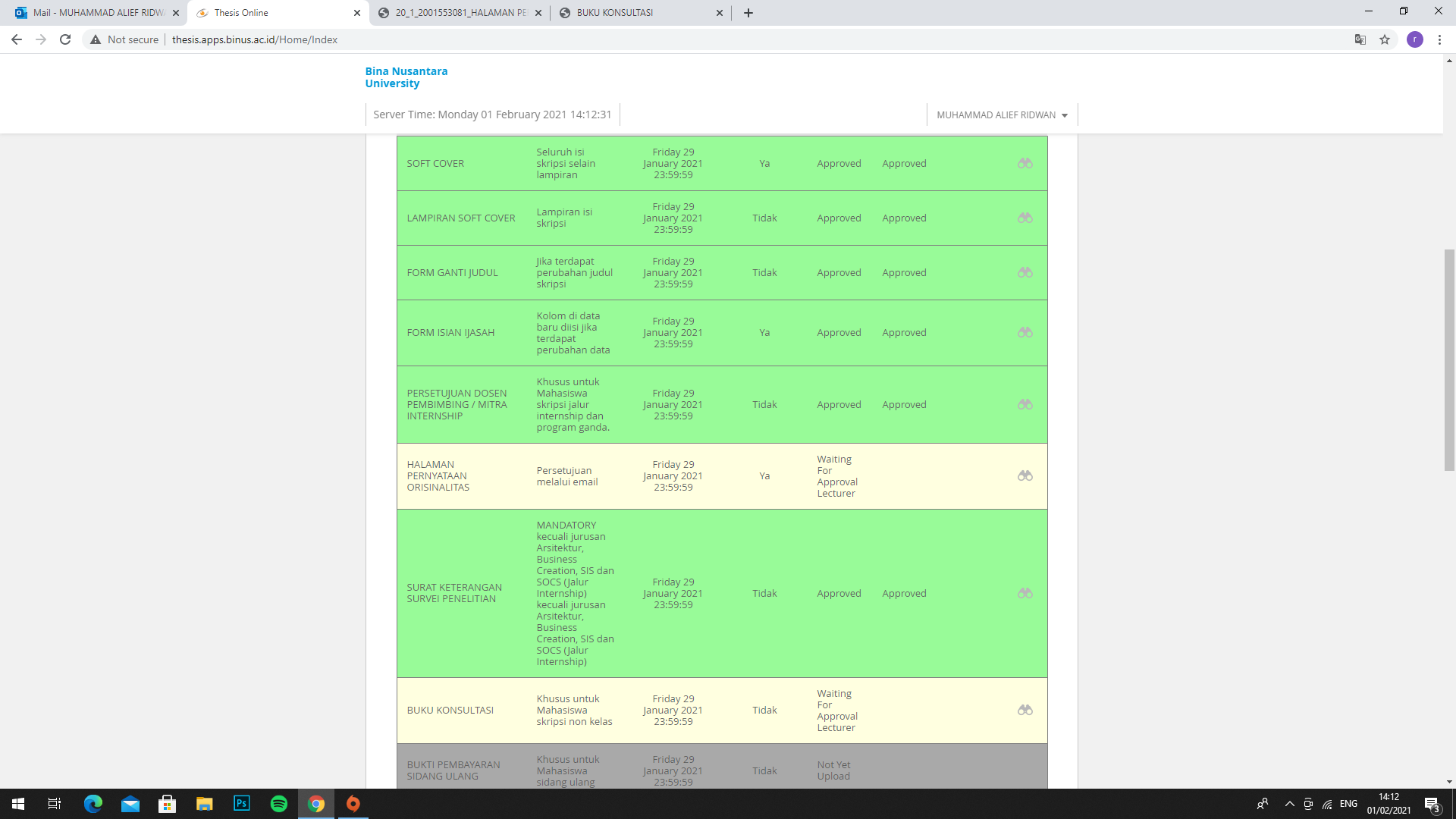 Saya mendapat email bahwa buku konsultasi saya masih belum dapat diterima karena ada kekurangan, sedangkan buku konsultasi tidak mandatory (tidak wajib diupload). dan pada web thesis.app pun saya tidak dapat melakukan revisi karena dikoiom tsb masih bewarna kuning belum bewarna merah. mohon bantuannya