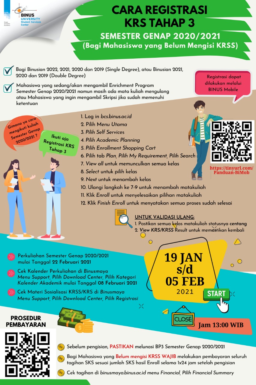 Di informasikan bahwa saat ini Anda belum melakukan registrasi untuk perkuliahan semester genap 2020/2021. Silakan Anda segera melakukan registrasi di bcs.binus.sc.id dan mohon untuk melakukan konfirmasi bahwa Anda akan aktif atau tidak di perkuliahan semester genap 2020/2021 melalui link http://bit.ly/konfirmasi-genap-2010.