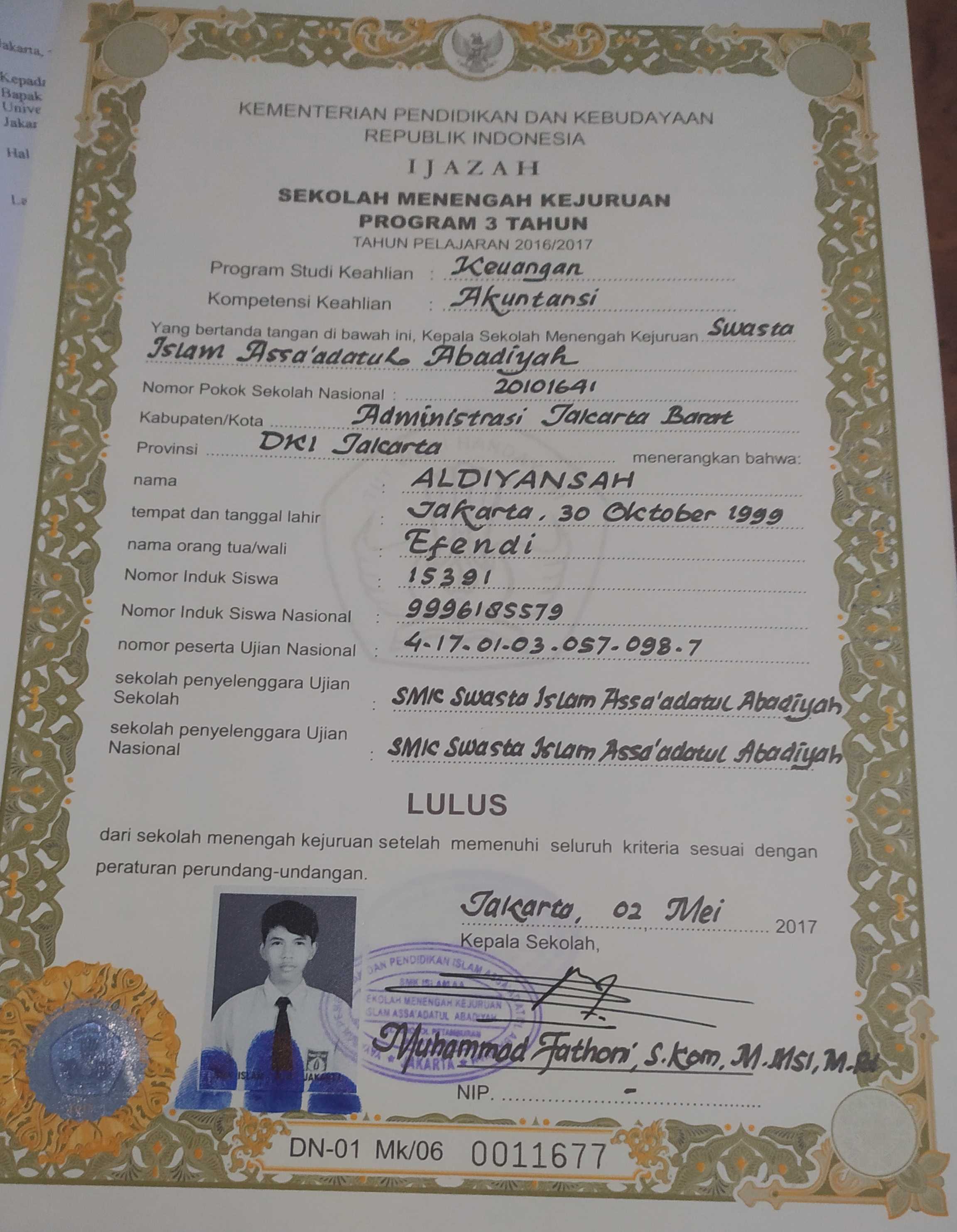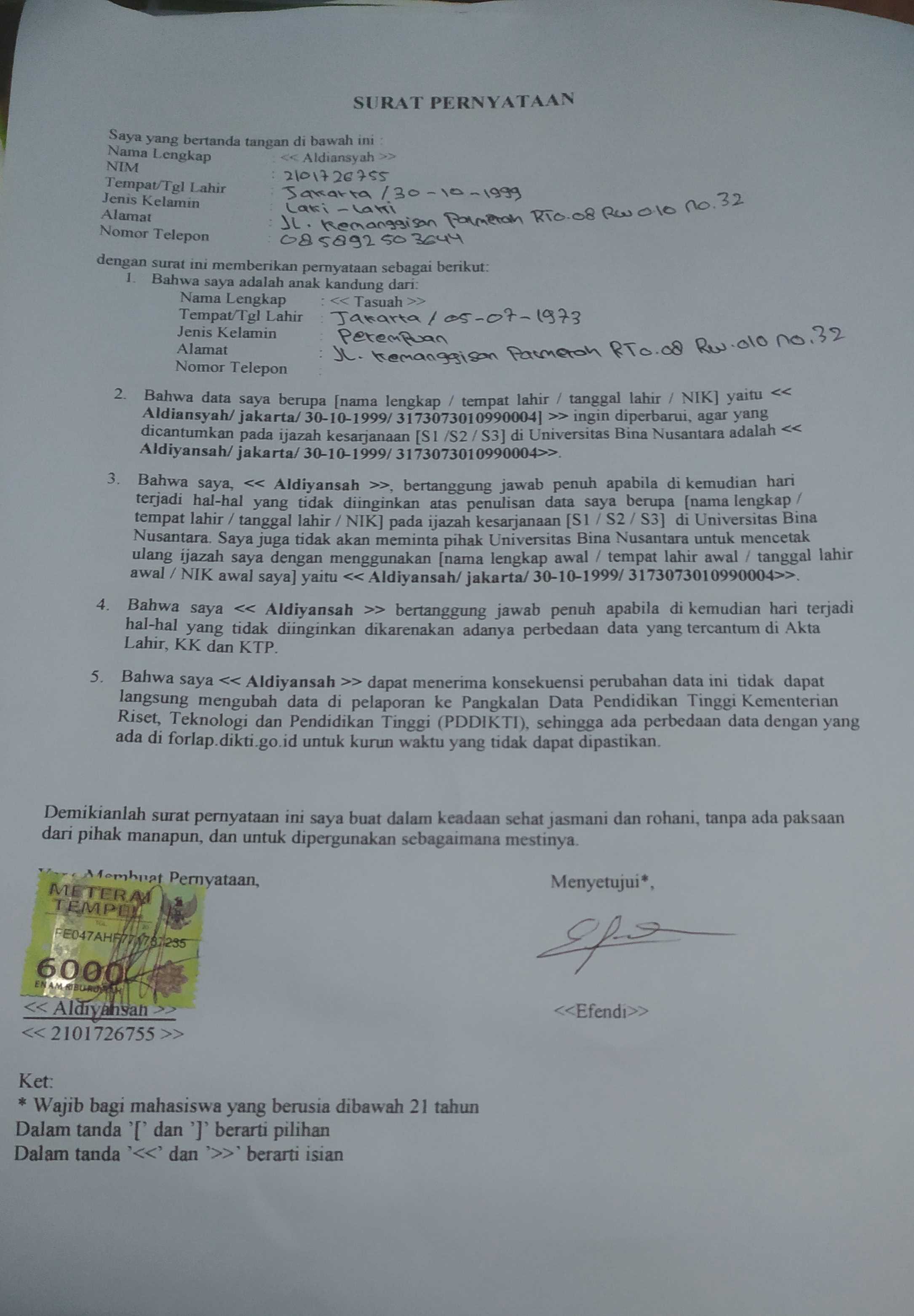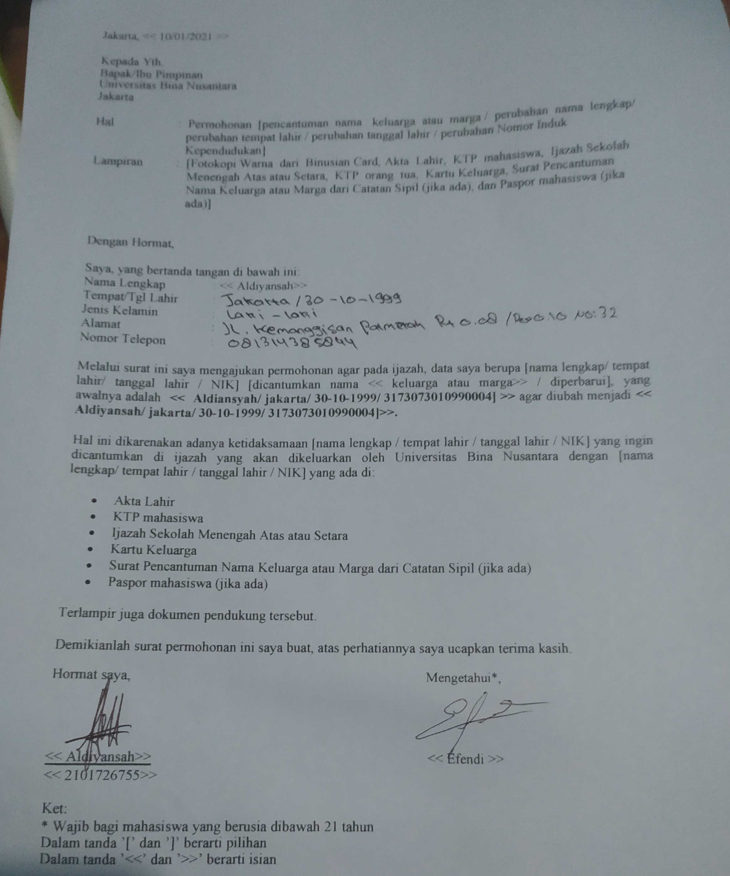 Saya mau melakukan pergantian nama di binus maya saya dari asal nama "ALDIANSYAH" menajadi "ALDIYANSAH" berikutnya saya lampirkan berkas yang di perlukan sesuai petunjuk dan intruksi di bimay