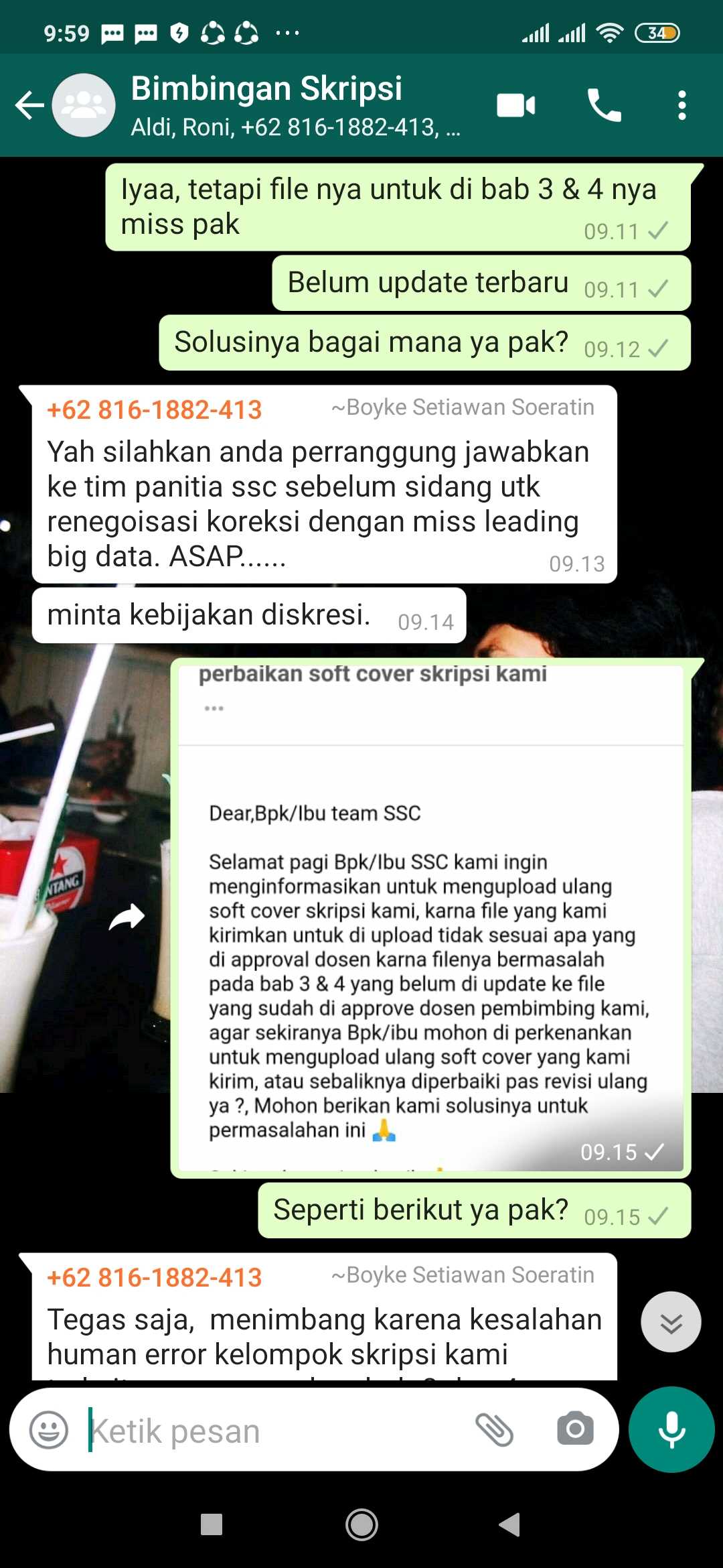 Selamat pagi Bpk/Ibu SSC kami ingin menginformasikan untuk mengupload ulang soft cover skripsi kami, karna file yang kami kirimkan untuk di upload tidak sesuai apa yang di approval dosen karna filenya bermasalah pada bab 3 & 4 yang belum di update ke file yang sudah di approve dosen pembimbing kami, agar sekiranya Bpk/ibu mohon di perkenankan untuk mengupload ulang soft cover yang kami kirim, atau sebaliknya diperbaiki pas revisi ulang ya ?, Mohon berikan kami solusinya untuk permasalahan ini 🙏