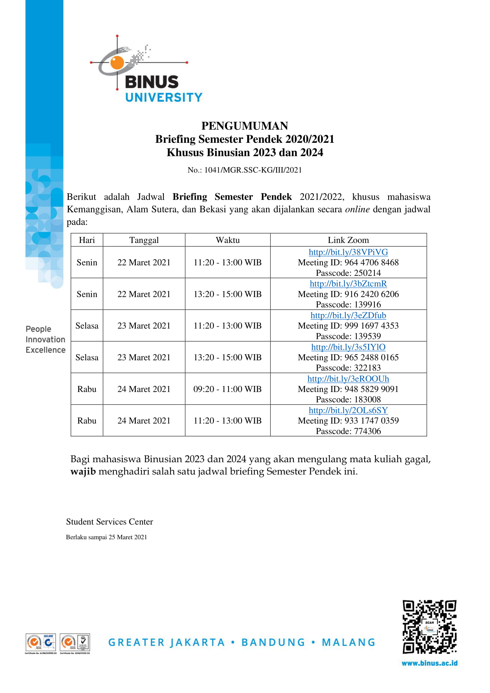 Jadwal Briefing Semester pendek 2020/2021 [SSC UPDATE - NO REPLY]